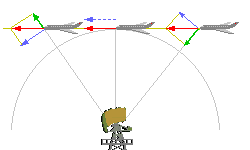 Ainsi sur l'image de droite, un radar suivant un avion se déplaçant parallèlement au sol ne peut noter que sa vitesse radiale (flèche verte) et non sa vitesse réelle (flèche rouge). Il est par contre possible de déduire avec une certaine précision la vraie vitesse et direction si la vitesse radiale de la cible est prise à intervalles réguliers. En effet, la composante radiale variant comme le cosinus de l'angle de visée entre le radar et la cible, il est possible d'extraire par analyse numérique l'information sur la vitesse réelle.