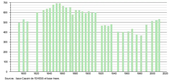 - ↑ Par convention dans Wikipédia, le principe a été retenu de n’afficher dans le tableau des recensements et le graphique, pour les populations légales postérieures à 1999, que les populations correspondant à une enquête exhaustive de recensement pour les communes de moins de 10 000 habitants, et que les populations des années 2006, 2011, 2016, etc. pour les communes de plus de 10 000 habitants, ainsi que la dernière population légale publiée par l’Insee pour l'ensemble des communes.