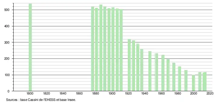 L'évolution du nombre d'habitants est connue à travers les recensements de la population effectués dans la commune depuis 1800. À partir du , les populations légales des communes sont publiées annuellement dans le cadre d'un recensement qui repose désormais sur une collecte d'information annuelle, concernant successivement tous les territoires communaux au cours d'une période de cinq ans. Pour les communes de moins de 10 000 habitants, une enquête de recensement portant sur toute la population est réalisée tous les cinq ans, les populations légales des années intermédiaires étant quant à elles estimées par interpolation ou extrapolation[1]. Pour la commune, le premier recensement exhaustif entrant dans le cadre du nouveau dispositif a été réalisé en 2007[2],[Note 1].