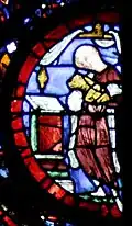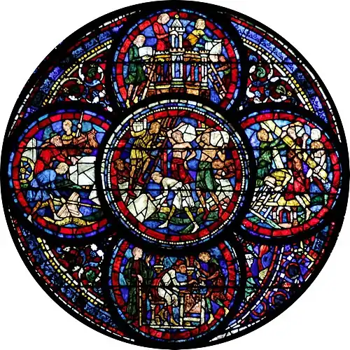 Ce vitrail a été l'un des premiers à traiter le sujet « les miracles de Notre-Dame »[2] C'est une verrière publicitaire montrant le chantier de la construction de la cathédrale Notre-Dame de Chartres, des pèlerins affluant, et les miracles attribués aux reliques qui y étaient l'objet de pèlerinage.