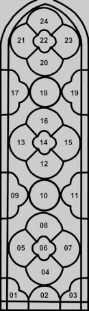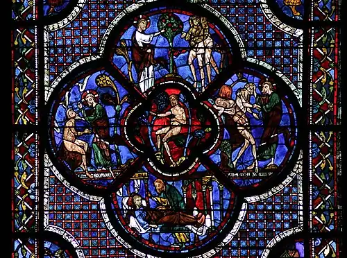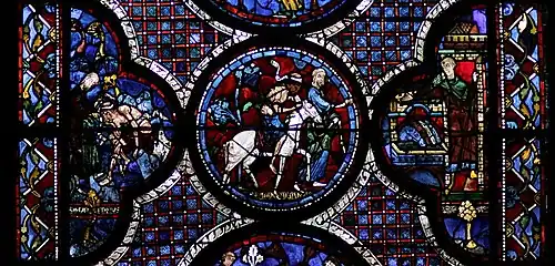 La fenêtre du Bon Samaritain de la cathédrale de Chartres se compose de 24 panneaux. La lecture se fait du bas en haut.