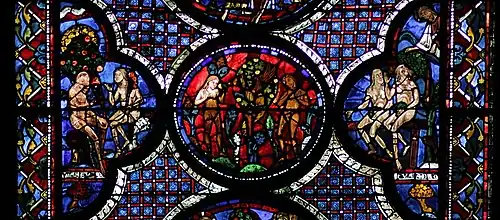 Dans la partie médiane est représentée l'histoire de la tentation et de la chute d'Adam et Ève[Note 2]. Dans la partie supérieure, la dernière scène du vitrail est le meurtre d'Abel par son frère Caïn[Note 3].
