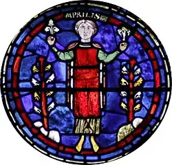 L'ordre est inversé entre cet étage et celui du Gémeaux, au centre[5]. Avril est le mois de la floraison. Un homme cueille des fleurs, celle qu'il tient dans sa main gauche est déjà flétrie. On peut y voir l'opposition entre la mort et la renaissance de la végétation, mais également une subtile allusion à la Nouvelle Alliance, qui rend caduque l'Ancienne Alliance. En face, un taureau, symbole de force et de travail. Méliton de Sardes en fait le symbole du sacrifice du Christ[3]. Mais cette force est brutale et dévastatrice si elle n'est pas dominée par la culture des vertus[4]. |