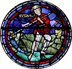 Le mois de janvier tire son nom du dieu romain Janus, dieu des passages, aux deux visages tournés l'un vers le passé et l'autre vers l'avenir. Ici Janus est représenté avec trois visages, ce qui est exceptionnel[3],[5]. C'est peut-être pour marquer le présent en sus du passé et du futur ; ou comme image trinitaire renvoyant à l'image du Dieu « chronocrator » du haut du vitrail. Janus, dieu des passages et des portes, est ici figuré sur le seuil, gardant la porte d'une ville dont le Verseau (astrologie) est en train de remplir les fossés. Ici, le symbolisme chrétien évoque par le Verseau (astrologie) le baptême, porte d'entrée dans la vie divine. | |