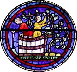Septembre est le mois des vendanges, représentées ici en même temps que le foulage en cuve. Le personnage de gauche, nu jusqu'aux cuisses, foule le raisin en s'appuyant sur un bâton extérieur. Septembre est également le mois où tombe l'équinoxe d'automne, marquant l'égalité des jours et des nuits, ce qu'évoque le signe de la Balance. Sur le plan du symbolisme chrétien, la balance évoque la pesée des âmes, à laquelle préside l'archange Saint Michel. De sa main gauche, le personnage semble « aider » discrètement la pesée[4], ce qui correspond à la prière traditionnellement adressée à Saint Michel, peseur des âmes : n'hésite pas à venir à mon secours à cette heure du jugement dernier. |