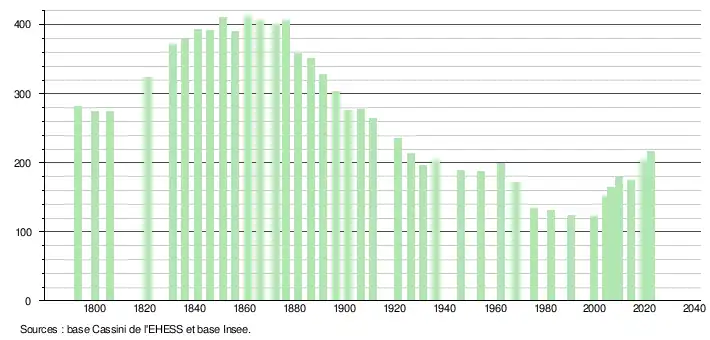 L'évolution du nombre d'habitants est connue à travers les recensements de la population effectués dans la commune depuis 1793. Pour les communes de moins de 10 000 habitants, une enquête de recensement portant sur toute la population est réalisée tous les cinq ans, les populations de référence des années intermédiaires étant quant à elles estimées par interpolation ou extrapolation[23]. Pour la commune, le premier recensement exhaustif entrant dans le cadre du nouveau dispositif a été réalisé en 2004[24].