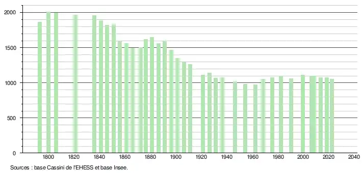 L'évolution du nombre d'habitants est connue à travers les recensements de la population effectués dans la commune depuis 1793. Pour les communes de moins de 10 000 habitants, une enquête de recensement portant sur toute la population est réalisée tous les cinq ans, les populations de référence des années intermédiaires étant quant à elles estimées par interpolation ou extrapolation[17]. Pour la commune, le premier recensement exhaustif entrant dans le cadre du nouveau dispositif a été réalisé en 2008[18].