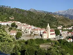 Quoique bâti sur une arête rocheuse à une altitude moyenne de 650 mètres, sur les flancs orientaux d'un petit chaînon montagneux orienté dans un axe sud-nord depuis la Punta Chiova (1 465 mètres), au nord du Monte Grosso, le village ne bénéficie pas d'un long ensoleillement journalier car entouré au sud et à l'est, d'une ligne de crête, celle d'un chaînon secondaire de la chaîne principale de l'île, articulé à la Punta dell'Oriente (2 112 m) et comprenant les sommets Punta Chiova (1 465 m), le col de Sorba (1 311 m), Punta Muro (1 565 m) Punta Paglia (1 528 m) et Punta di Tana (1 281 m), et à l'ouest par la haute ligne de crête de la dorsale corse, du Monte Rotondo au Monte d'Oro.