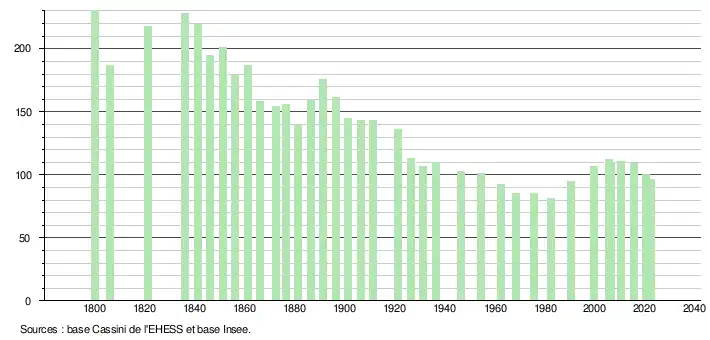 L'évolution du nombre d'habitants est connue à travers les recensements de la population effectués dans la commune depuis 1800. Pour les communes de moins de 10 000 habitants, une enquête de recensement portant sur toute la population est réalisée tous les cinq ans, les populations de référence des années intermédiaires étant quant à elles estimées par interpolation ou extrapolation[25]. Pour la commune, le premier recensement exhaustif entrant dans le cadre du nouveau dispositif a été réalisé en 2005[26].
