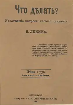 Outre son travail à l'Iskra, Vladimir Oulianov, dont les premiers ouvrages n'ont pas eu le retentissement espéré dans les milieux politiques russes, rédige une brochure intitulée Que faire ?, le titre étant un hommage au roman homonyme de Nikolaï Tchernychevski. De même que Tchernychevski avait décrit l'activité des militants révolutionnaires russes, Oulianov souhaite exposer ses conceptions sur le moyen d'organiser un parti politique clandestin dans le contexte tsariste. Il signe cette brochure du nom de plume N. Lénine (peut-être inspiré du fleuve sibérien Léna), qu'il avait déjà employé pour signer des lettres adressées à Plekhanov[67],[68], ainsi que quelques articles. L'attention que suscite Que faire ? dans les milieux marxistes russes aboutit à ce que Lénine devienne le pseudonyme définitif d'Oulianov[67].