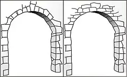 La voûte transforme les actions verticales dues à la pesanteur en efforts de pression dans son épaisseur. La stabilité des voûtes est assurée par la reprise de la poussée de la voûte par les murs ou les piles[17]. Dans deux mémoires publiés dans les Mémoires de l'Académie royale des Sciences, en 1729 et 1731, Pierre Couplet de Tartereaux étudie l'équilibre des voûtes en partant de l'hypothèse d'une simple rotation autour des arêtes de leurs voussoirs. Il étudie la stabilité de la voûte en la supposant constituée de quatre voussoirs égaux attachés ensemble par des charnières. Augustin Danyzy fait des expériences en modèle réduit qui démontrent la validité de la théorie de Couplet sur le mode de renversement des voûtes.