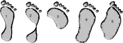 L'empreinte que laisse la plante des pieds n'est pas totale. Généralement, seuls sont visibles les orteils ainsi que le talon, reliés par une ligne mince et latérale appelée isthme.