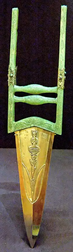 - Damasquinage : technique artistique qui consiste à enchâsser un fil de cuivre, d'or ou d'argent, sur une surface métallique, généralement de fer ou d'acier, afin de créer un motif décoratif.