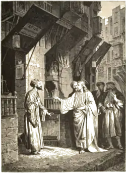 Selon l'Évangile selon Matthieu: "Jésus partit de là et vit, en passant, un homme, du nom de Matthieu, assis à son bureau de collecteur d’impôts. Il lui dit : « Suis-moi. » L’homme se leva et le suivit."[2]