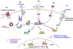 L'insuline est une hormone peptidique impliquée dans l'homéostasie du glucose au sein de certains organismes. Plus précisément, cela conduit à une régulation positive des transporteurs de glucose dans la membrane cellulaire afin d’augmenter l’absorption du glucose dans le sang. Ce processus est partiellement médié par l'activation de la signalisation Wnt/β-caténine, qui peut augmenter la sensibilité à l'insuline d'une cellule. En particulier, WNT10B est une protéine Wnt qui augmente cette sensibilité dans les cellules musculaires squelettiques[61].
