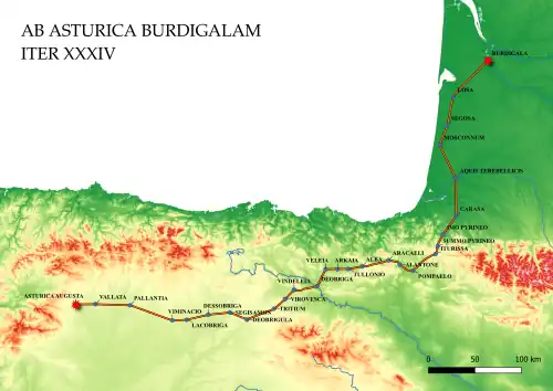 L'Itinéraire d'Antonin mentionne entre Aquae Tarbellicae (Dax) et Pompaelo (Pampelune), les stations de Carasa (Garris ou Ostabat ?), Imus Pyrenaeus (Ugange, sur la commune de Saint-Jean-Pied-de-Port, ou Saint-Jean-le-Vieux ?), Summus Pyrenaeus (col de Roncevaux, col de Lepoeder, ou encore Campaita ?) et Iturissa (Aurizberri, au lieu-dit Alteabalsa, municipalité d'Erro).