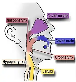 - la partie haute de la voie respiratoire (qui débute aux narines et comprend successivement les fosses nasales, le nasopharynx, l'oropharynx et le larynx) pour s'arrêter au début de la trachée. Les sinus de la face et de l'oreille moyenne y sont connectés.