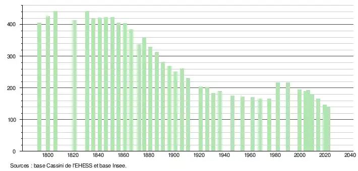 L'évolution du nombre d'habitants est connue à travers les recensements de la population effectués dans la commune depuis 1793. Pour les communes de moins de 10 000 habitants, une enquête de recensement portant sur toute la population est réalisée tous les cinq ans, les populations de référence des années intermédiaires étant quant à elles estimées par interpolation ou extrapolation[16]. Pour la commune, le premier recensement exhaustif entrant dans le cadre du nouveau dispositif a été réalisé en 2004[17].