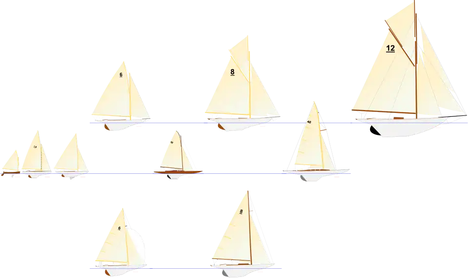 Les séries vont du plus petit dériveur, le dinghy international 12 pieds de 3,70 m, au 12 m Jauge internationale de plus de 23 m.