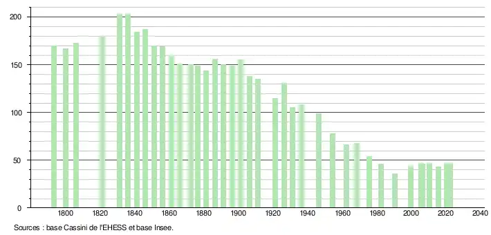 L'évolution du nombre d'habitants est connue à travers les recensements de la population effectués dans la commune depuis 1793. Pour les communes de moins de 10 000 habitants, une enquête de recensement portant sur toute la population est réalisée tous les cinq ans, les populations de référence des années intermédiaires étant quant à elles estimées par interpolation ou extrapolation[22]. Pour la commune, le premier recensement exhaustif entrant dans le cadre du nouveau dispositif a été réalisé en 2005[23].
