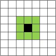 Plus généralement, le voisinage de Moore d'ordre d'une cellule est constitué de la cellule centrale et des cellules qui l'entourent à une distance de Tchebychev de au plus .