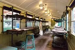 - à cette date[Quand ?], la SNCF s'est dotée de 27 voitures-ambulances à suspension douce Corail (17 Vu-75 et 10 VU-80)[2] ; elles disposent d'une plateforme d'accès conventionnelle en extrémité de caisse et d'une autre en milieu de caisse, accessible aux brancards grâce à une porte coulissante large ; elles offrent 40 couchettes-brancards[3] (jusqu'à 60 pour les transports de groupes comme les colonies de vacances[4]) disposées longitudinalement(mode voiture-dortoir) ; contrairement aux autres voitures Corail, ces voitures n'ont pas été climatisées, pour permettre le passage d'objets (bonbonnes à oxygène, systèmes de perfusion etc.) par les baies ouvrantes, également parce que l'air conditionné ne convient pas à tous les types de malades. Ce sont les derniers véhicules SNCF mis en service, ayant un chauffage mixte électrique (conforme RIC) et Vapeur, afin d'être incorporés à des trains de pèlerins italiens, n'ayant pas de chauffage electrique, d'où le recours, dans ce cas, à un fourgon-chaudière. De nos jours, lors des passages en révisions de ces véhicules, et changement de couleur de peinture, le chauffage Vapeur, a été définitivement supprimé[5].