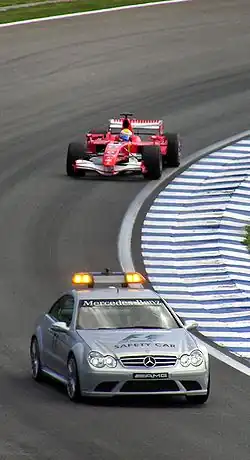 Depuis 1997, la voiture de sécurité est fournie par Mercedes-Benz et préparée par AMG. Divers modèles de la marque ont été utilisés depuis cette date, comme la SLK 55 AMG ou la CLK 63 AMG, ou encore une SL 63 AMG[5]. En apparence il s'agit d'une voiture de série, mais celle-ci a subi diverses modifications pour améliorer ses performances. La notion de « ralenti » est en effet toute relative ; ce qui est considéré comme une vitesse lente pour une Formule 1 l'est beaucoup moins pour la voiture de sécurité. À son volant, on retrouve d'ailleurs généralement un pilote de course professionnel. En F1, c'est l'Allemand Bernd Mayländer, ancien pilote en DTM et FIA GT, qui tient ce rôle depuis 2000, il a brièvement été remplacé par Marcel Fässler lors du Grand Prix du Canada 2001. Avant lui c'est Oliver Gavin qui a assuré ce rôle entre 1997 et 1999.