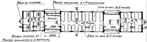 Ces voitures disposent de deux grandes plates-formes d'accès équipées de portes à deux vantaux coulissant derrière deux vantaux dormants. Le porche d'accès, à quatre fenêtres sur les portes et les panneaux fixes, est en retrait et servi par un double marchepied en bois. L'accès aux portes est facilité par des mains courantes latérales inclinées et une barre centrale extérieure. Les chaudrons des voitures de série étaient dotés de six baies dans la partie centrale, sauf pour les caisses de type A et de l'élément central de la rame triple qui n'en comportaient que cinq ou quatre, et de deux baies aux extrémités, sauf pour les caisses de type -D- ou -s- qui disposaient, respectivement, d'un compartiment fourgon ou d'une cabine de conduite. L'aménagement est classiquement constitué de banquettes en vis-à-vis, de trois places d'un côté de l'allée et de deux places de l'autre côté. Elles sont initialement dépourvues de toilettes ; un cabinet de toilette sera installé à l'extrémité opposée, côté plateforme, à la fin des années 1960.
