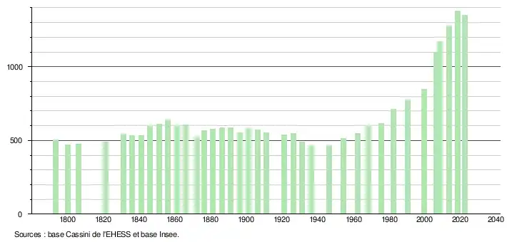L'évolution du nombre d'habitants est connue à travers les recensements de la population effectués dans la commune depuis 1793. Pour les communes de moins de 10 000 habitants, une enquête de recensement portant sur toute la population est réalisée tous les cinq ans, les populations de référence des années intermédiaires étant quant à elles estimées par interpolation ou extrapolation[20]. Pour la commune, le premier recensement exhaustif entrant dans le cadre du nouveau dispositif a été réalisé en 2008[21].
