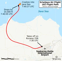 Le , le Boeing 737-500 effectuant le vol Sriwijaya Air 182, un vol intérieur régulier à destination de l'aéroport Supadio de Pontianak, disparaît des radars quatre minutes après son décollage[1] de l'aéroport international Soekarno-Hatta de Jakarta, en Indonésie, et s'écrase en mer de Java, à proximité des îles Seribu[1], ne laissant aucun survivant parmi les 56 passagers et 6 membres d'équipage présents à bord.