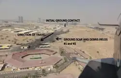 L'avion était trop haut lors de son approche et le train d'atterrissage ne s'est pas sorti. L'avion a survolé l'aéroport avant d'effectuer un virage serré. Le copilote Bell a tenté de se tourner vers l'aéroport international de Sharjah, mais a inconsciemment tourné dans la mauvaise direction. En effet, le contrôleur propose au pilote d'effectuer un virage au cap 95 mais à cause de la fumée, il entre par erreur le cap 195 dans le pilote automatique. S'en rendant compte, il débranche le pilote automatique mais les flammes ont détruit les câbles de commande. Le contact radar a été perdu peu après à 15 h 42 UTC. L'avion a finalement percuté le sol à un angle assez faible mais à une grande vitesse dans une zone peu peuplée entre Emirates Road (en) et Al Ain Highway, près du camp militaire de Nad Al Sheba (en)[18],[19]. L'aile droite a touché le sol en premier et le 747 en feu a dérapé sur quelques mètres et a explosé dans une boule de feu, tuant le copilote instantanément[20],[21],[22].