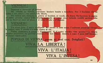 Les sept avions survivants, cependant, ont poursuivi leur vol vers la capitale autrichienne, organisés en formation en coin et dirigés par les pilotes suivants: le capitaine Natale Palli et le commandant Gabriele D'Annunzio, le lieutenant Ludovico Censi, le lieutenant Aldo Finzi, le lieutenant Giordano Bruno Granzarolo, le lieutenant Antonio Locatelli, le lieutenant Pietro Massoni et le sous-lieutenant Girolamo Allegri, connu sous le nom de "Fra Ginepro" en raison de sa barbe épaisse. Après avoir survolé la vallée de la Drave, les montagnes de Carinthie, et enfin les villes de Reichenfels, Kapfenberg et Neuberg, sans aucune embuscade de la part de l'aviation autrichienne (seuls deux chasseurs autrichiens qui avaient repéré la formation se sont précipités à terre pour avertir le commandement, mais n'ont pas été crus), et en surmontant des formations orageuses, la formation italienne atteint Vienne en groupe compact à 9h20, tandis que dans les rues et sur les places en contrebas, une grande foule se rassemblait, craignant la présence des avions[3]. Grâce à la clarté du ciel, la formation a pu descendre à moins de 800 mètres d'altitude et lancer 50 000 exemplaires d'un tract en italien préparé par D'Annunzio qui disait[4] :