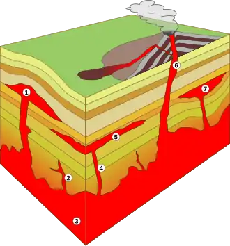 Le magma provenant du manteau, ou de la croûte inférieure, monte à travers la croûte vers la surface. Si le magma atteint la surface, son comportement dépend de la viscosité de la roche fondue qui le compose.