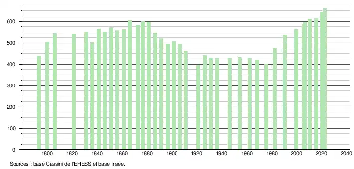 L'évolution du nombre d'habitants est connue à travers les recensements de la population effectués dans la commune depuis 1793. Pour les communes de moins de 10 000 habitants, une enquête de recensement portant sur toute la population est réalisée tous les cinq ans, les populations de référence des années intermédiaires étant quant à elles estimées par interpolation ou extrapolation[15]. Pour la commune, le premier recensement exhaustif entrant dans le cadre du nouveau dispositif a été réalisé en 2005[16].