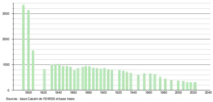 L'évolution du nombre d'habitants est connue à travers les recensements de la population effectués dans la commune depuis 1793. Pour les communes de moins de 10 000 habitants, une enquête de recensement portant sur toute la population est réalisée tous les cinq ans, les populations de référence des années intermédiaires étant quant à elles estimées par interpolation ou extrapolation[25]. Pour la commune, le premier recensement exhaustif entrant dans le cadre du nouveau dispositif a été réalisé en 2006[26].