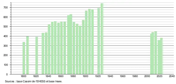 L'évolution du nombre d'habitants est connue à travers les recensements de la population effectués dans la commune depuis 1800. Pour les communes de moins de 10 000 habitants, une enquête de recensement portant sur toute la population est réalisée tous les cinq ans, les populations de référence des années intermédiaires étant quant à elles estimées par interpolation ou extrapolation[17]. Pour la commune, le premier recensement exhaustif entrant dans le cadre du nouveau dispositif a été réalisé en 2008[18].