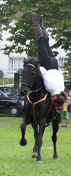 - Le drapeau : le voltigeur s'appuie sur les étriers et se met debout perpendiculaire au cheval et parallèle au sol.