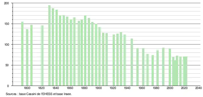 L'évolution du nombre d'habitants est connue à travers les recensements de la population effectués dans la commune depuis 1793. Pour les communes de moins de 10 000 habitants, une enquête de recensement portant sur toute la population est réalisée tous les cinq ans, les populations de référence des années intermédiaires étant quant à elles estimées par interpolation ou extrapolation[15]. Pour la commune, le premier recensement exhaustif entrant dans le cadre du nouveau dispositif a été réalisé en 2004[16].