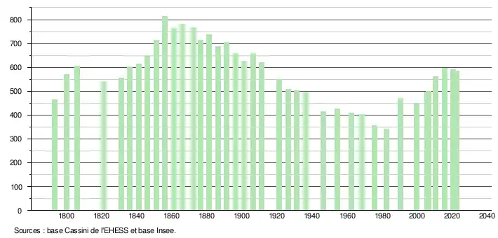 L'évolution du nombre d'habitants est connue à travers les recensements de la population effectués dans la commune depuis 1793. Pour les communes de moins de 10 000 habitants, une enquête de recensement portant sur toute la population est réalisée tous les cinq ans, les populations de référence des années intermédiaires étant quant à elles estimées par interpolation ou extrapolation[18]. Pour la commune, le premier recensement exhaustif entrant dans le cadre du nouveau dispositif a été réalisé en 2005[19].