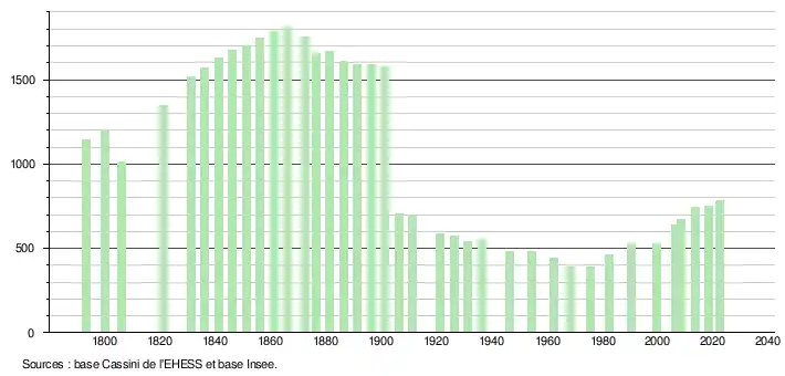 L'évolution du nombre d'habitants est connue à travers les recensements de la population effectués dans la commune depuis 1793. Pour les communes de moins de 10 000 habitants, une enquête de recensement portant sur toute la population est réalisée tous les cinq ans, les populations de référence des années intermédiaires étant quant à elles estimées par interpolation ou extrapolation[16]. Pour la commune, le premier recensement exhaustif entrant dans le cadre du nouveau dispositif a été réalisé en 2008[17].