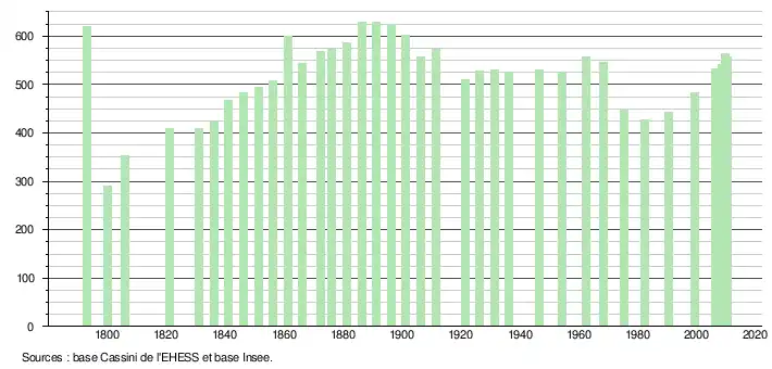 L'évolution du nombre d'habitants est connue à travers les recensements de la population effectués dans la commune depuis 1793. À partir du , les populations légales des communes sont publiées annuellement dans le cadre d'un recensement qui repose désormais sur une collecte d'information annuelle, concernant successivement tous les territoires communaux au cours d'une période de cinq ans. Pour les communes de moins de 10 000 habitants, une enquête de recensement portant sur toute la population est réalisée tous les cinq ans, les populations légales des années intermédiaires étant quant à elles estimées par interpolation ou extrapolation[3]. Pour la commune, le premier recensement exhaustif entrant dans le cadre du nouveau dispositif a été réalisé en [4],[Note 1].