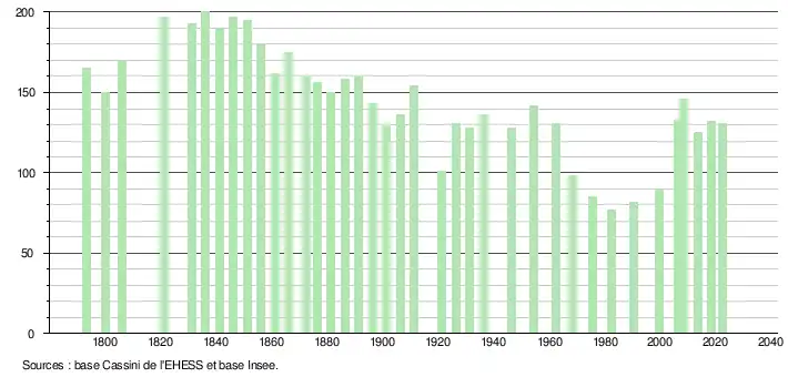 L'évolution du nombre d'habitants est connue à travers les recensements de la population effectués dans la commune depuis 1793. Pour les communes de moins de 10 000 habitants, une enquête de recensement portant sur toute la population est réalisée tous les cinq ans, les populations de référence des années intermédiaires étant quant à elles estimées par interpolation ou extrapolation[15]. Pour la commune, le premier recensement exhaustif entrant dans le cadre du nouveau dispositif a été réalisé en 2008[16].