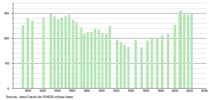 L'évolution du nombre d'habitants est connue à travers les recensements de la population effectués dans la commune depuis 1793. Pour les communes de moins de 10 000 habitants, une enquête de recensement portant sur toute la population est réalisée tous les cinq ans, les populations de référence des années intermédiaires étant quant à elles estimées par interpolation ou extrapolation[37]. Pour la commune, le premier recensement exhaustif entrant dans le cadre du nouveau dispositif a été réalisé en 2007[38].