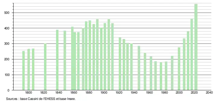 L'évolution du nombre d'habitants est connue à travers les recensements de la population effectués dans la commune depuis 1793. Pour les communes de moins de 10 000 habitants, une enquête de recensement portant sur toute la population est réalisée tous les cinq ans, les populations de référence des années intermédiaires étant quant à elles estimées par interpolation ou extrapolation[10]. Pour la commune, le premier recensement exhaustif entrant dans le cadre du nouveau dispositif a été réalisé en 2006[11].