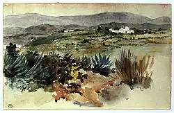Le , la délégation part de Tanger pour Meknès, à 45 lieues de là, accompagnée d’une escorte de soldats et d’un pacha pour chaque étape, dans la limite de la province où s’exerce leur autorité[25]. Une fois passé le gué à l’oued Mharhar, un premier campement est établi à El Arba Aïn-Dalia. Le , la mission et l’escorte passent près du lac Lao, et de la mer, avec à droite, une vue du Cap Spartel. Nouvelle étape à Souk el-Had el-Gharbia, le soir, ils dînent avec le caïd Mohammed Ben-Abou et font une halte à Tléta Rissana. Le , ils partent sous la pluie et passent le gué de l’oued Maghazen, affluent de l’oued Loukkos. Ils déjeunent ensuite à l’oued Ouarrour, près de Ksar El Kébir (appelé aussi Alcazarquivir), lieu de la Bataille des Trois Rois. Le , ils s’arrêtent à Ksar El Kébir : le vendredi étant un jour de prière. Dans la soirée, ils se dirigent vers l’oued Fouarate où la délégation est attaquée. Delacroix s’en souviendra pour La Perception de l’impôt arabe ou Combat d'Arabes dans la montagne, (National Gallery de Washington), tableau qu’il peignit en 1863, année de sa mort[26]. C’est à Fouarate qu’un campement est installé pour la nuit. Le , à cause d’un malaise du peintre et du jour du Sabbat (jour de repos des juifs), le départ de la mission est différé. Ils passent tout de même l’oued Mda[27] et installent leur campement à El-Arba de Sidi Aîssa Belhacen.