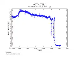 | Fin , les instruments de Voyager 1 détectent une chute du nombre de particules énergétiques issues du vent solaire (schéma de gauche) et une élévation du nombre de particules du rayonnement cosmique (à droite) indices de la sortie de la zone d'influence magnétique du Soleil. | |