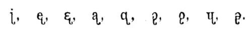 - en utilisant le crochet rétroflexe comme diacritique : [ᶏ ᶐ ᶒ ᶓ ᶔ ᶕ ᶖ 𝼚 𝼛 ᶗ ᶙ], etc.