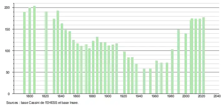 L'évolution du nombre d'habitants est connue à travers les recensements de la population effectués dans la commune depuis 1793. Pour les communes de moins de 10 000 habitants, une enquête de recensement portant sur toute la population est réalisée tous les cinq ans, les populations de référence des années intermédiaires étant quant à elles estimées par interpolation ou extrapolation[17]. Pour la commune, le premier recensement exhaustif entrant dans le cadre du nouveau dispositif a été réalisé en 2007[18].