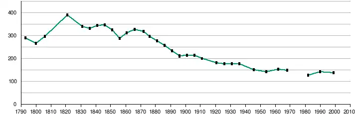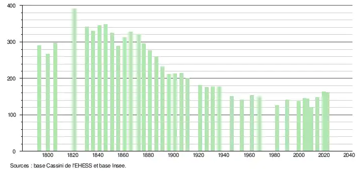 L'évolution du nombre d'habitants est connue à travers les recensements de la population effectués dans la commune depuis 1793. Pour les communes de moins de 10 000 habitants, une enquête de recensement portant sur toute la population est réalisée tous les cinq ans, les populations de référence des années intermédiaires étant quant à elles estimées par interpolation ou extrapolation[14]. Pour la commune, le premier recensement exhaustif entrant dans le cadre du nouveau dispositif a été réalisé en 2004[15].