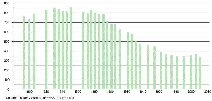 - ↑ Par convention dans Wikipédia, le principe a été retenu de n’afficher dans le tableau des recensements et le graphique, pour les populations légales postérieures à 1999, que les populations correspondant à une enquête exhaustive de recensement pour les communes de moins de 10 000 habitants, et que les populations des années 2006, 2011, 2016, etc. pour les communes de plus de 10 000 habitants, ainsi que la dernière population légale publiée par l’Insee pour l'ensemble des communes.